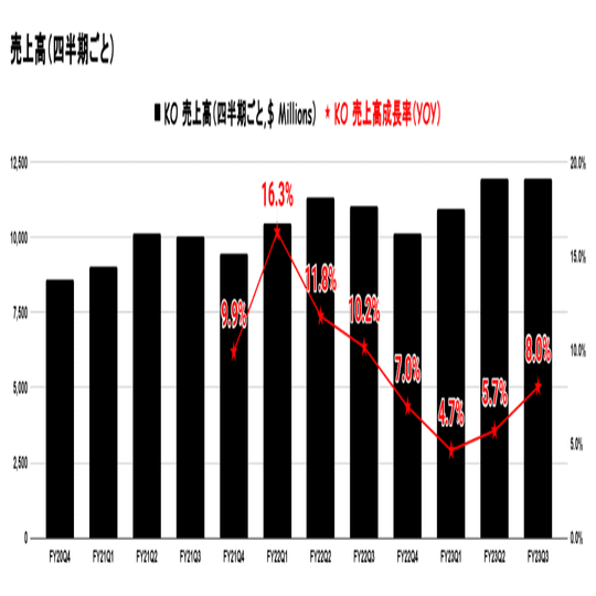 このデータから、コカ・コーラ社は市場の変動に対応しながらも、安定した成長を継続していることが伺えます。