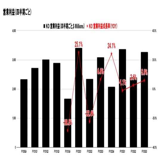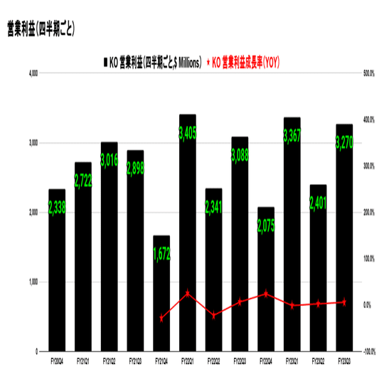 このデータから、コカ・コーラ社の営業利益成長率には四半期ごとに大きな変動があるものの、全体的には安定して回復していることがわかります。