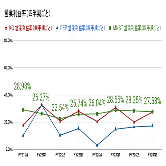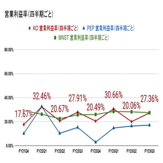 コカ・コーラ社(KO)、ペプシコ(PEP)、モンスターベバレッジ(MNST)の四半期ごとの営業利益率のデータを比較分析すると、以下のような傾向と変化が見られます。